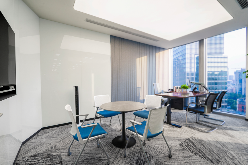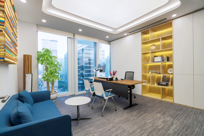 總經(jīng)理辦公室整體設計以木色和白色相結合,展現出高效和清新的氛圍。白色燈膜把墻面四周打亮,給辦公室增添了許多氛圍,并且更顯寬敞。藍色沙發(fā)的點(diǎn)綴為辦公室注入了生機和活力,與整體簡(jiǎn)約風(fēng)格形成和諧的對比。