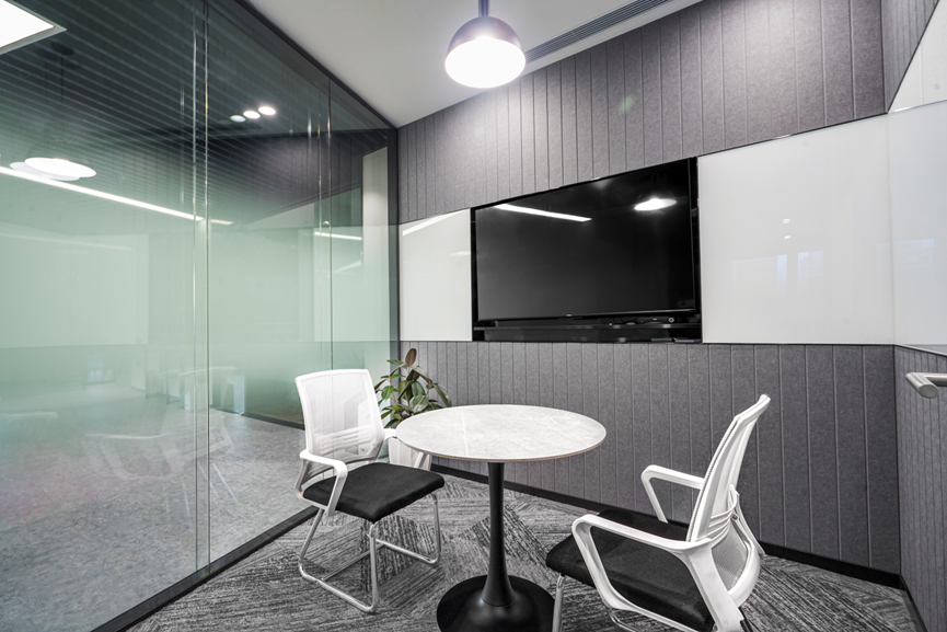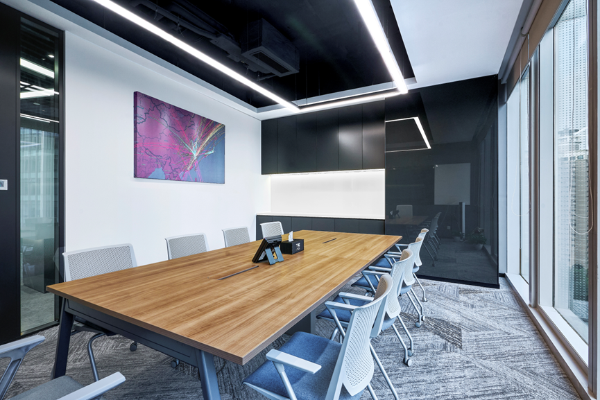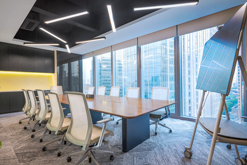 前廳的后方是一個(gè)可容納二三十人的大會(huì )議室。會(huì )議室是局部裸頂設計,中間四處散開(kāi)的條形燈,賦予了整個(gè)空間詩(shī)意和藝術(shù)氣息。地面上的漸變灰白色地毯為線(xiàn)性散發(fā),相互交織。原有的柱子鋪貼了灰色背漆玻璃,可以在會(huì )議時(shí)進(jìn)行記錄或書(shū)寫(xiě)。與旁邊的灰色柜體相結合,看起來(lái)宛如本應該如此一般,更加耐看性和融入感。大會(huì )議室與其他會(huì )議不同,由于空間大,設有移動(dòng)會(huì )議系統,使用起來(lái)更加便捷。